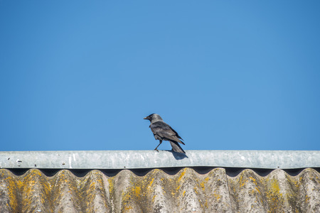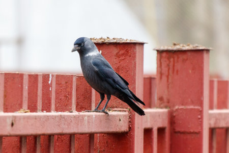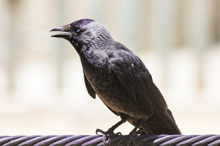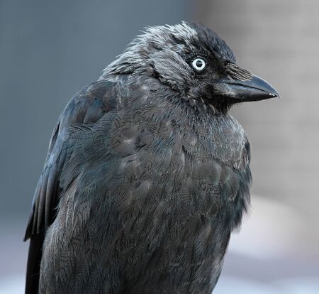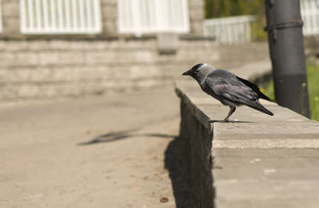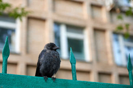The Eastern Eurasian Jackdaw (Coloeus monedula) against urban environment background with space for your text. Shallow depth, selective focus.