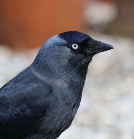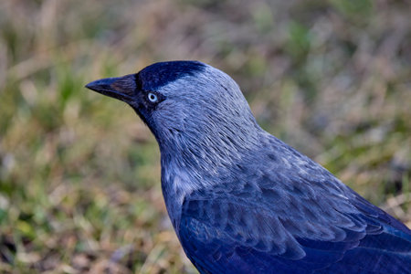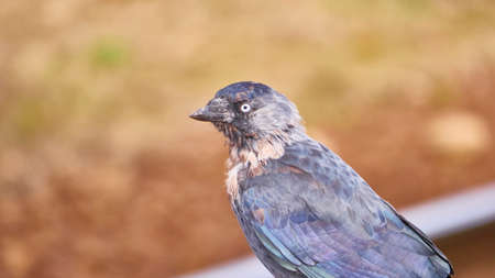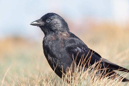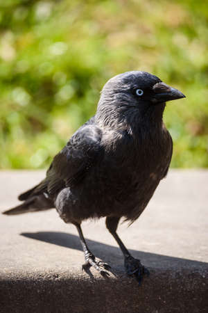 Jackdaw bird, Corvus monedula, on ground closeup portrait, selective focus, shallow DOF.