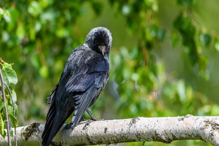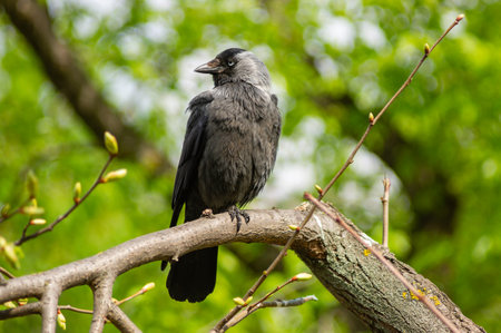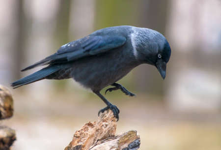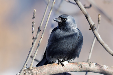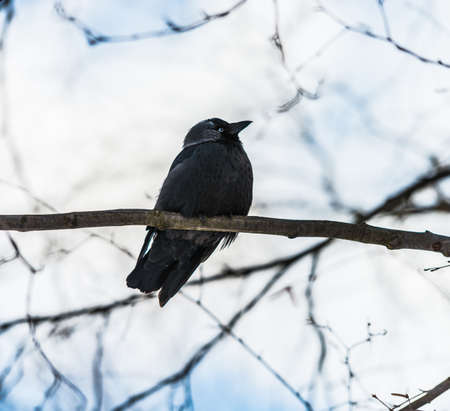 Jackdaw sitting on the branch on a sunny autumn afternoon. A blurred background that cuts off the subject nicely
