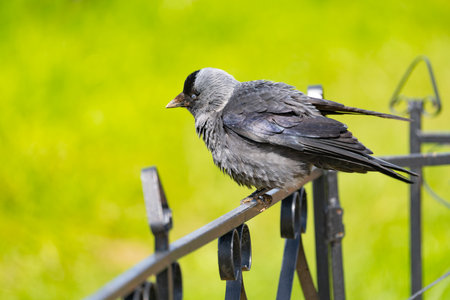 A gray crow or jackdaw is sitting on a metal fence on a summer day