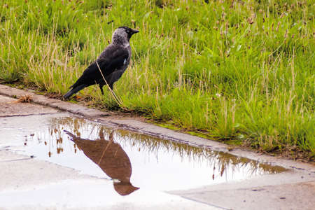 Bird The European (Corvus monedula) stands in a meadow with reflection after rain near a puddle of water