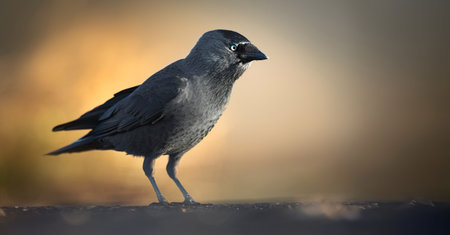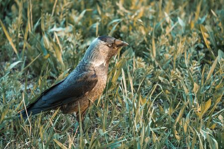 Selective focus photo. Western jackdaw bird, Coloeus monedula.