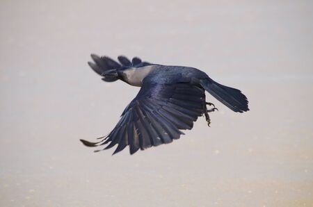 Western Jackdaw (Coloeus monedula) in flight on bright background. Wildlife scene of nature in Europe.