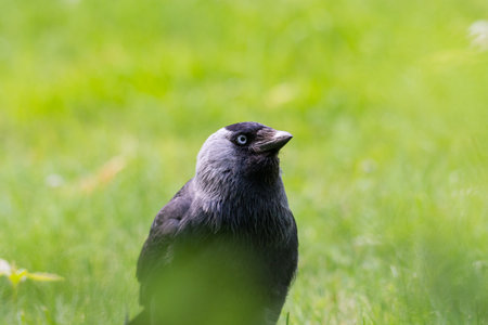 Young black crow jackdaw Corvus monedula with blue eyes sitting in green grass and on a green background in Klushof Bremerhaven Germany.