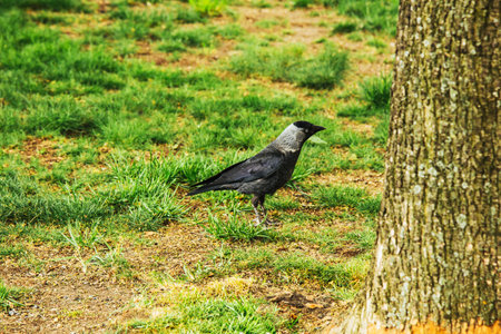 Prague, Czech Republic - May 11, 2019: The western jackdaw (Coloeus monedula), also known as the Eurasian jackdaw. A beautiful bird walking on grass. An European bird in park.