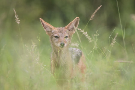 An attentive wild baby black backed jackel in natural environment surrounded by green grass on a savannah in Kenya, Africa.
