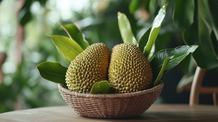 A fresh jackfruit pod displayed in a small basket, with hints of greenery in the background.