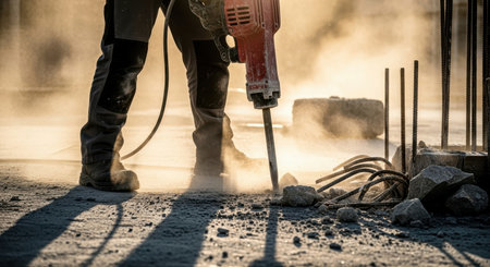 A construction worker uses a jackhammer to break concrete on a dusty construction site. Debris and rebar are scattered around, highlighting demolition work and hard labor.