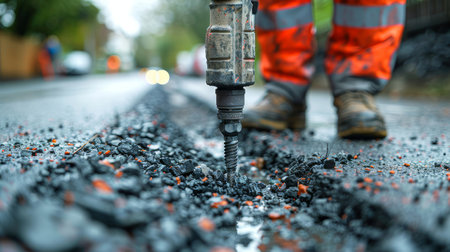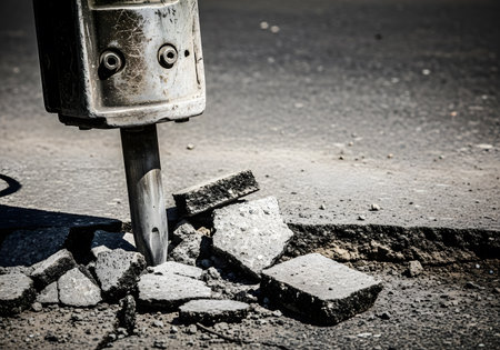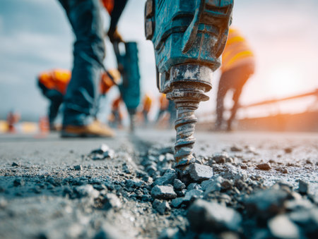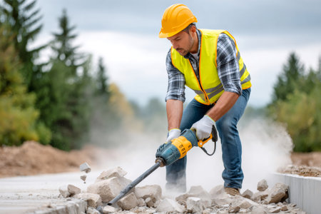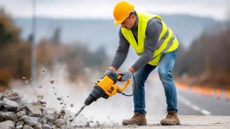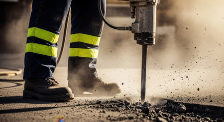Construction worker breaking concrete with a powerful jackhammer tool on a roadwork site