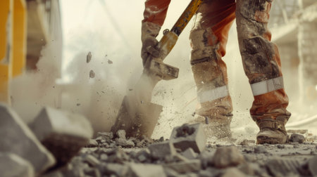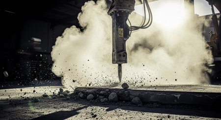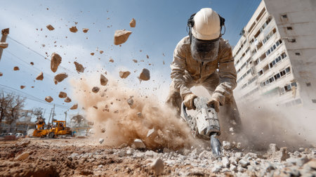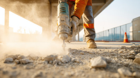 A construction worker skillfully uses a jackhammer to break through concrete, sending dust and sparks into the air while ensuring safety with protective gear.