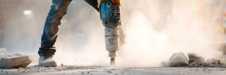 Worker uses a jackhammer to break concrete at a construction site, creating dust clouds while engaged in heavy labor during daylight hours.