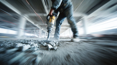 A worker operates a jackhammer on a construction site, creating motion blur that captures the intensity and energy of the task in progress.