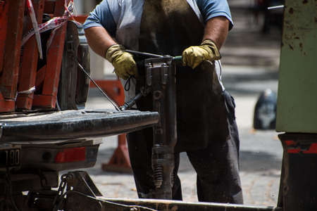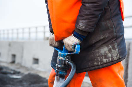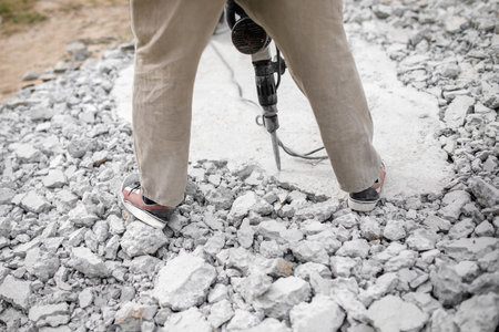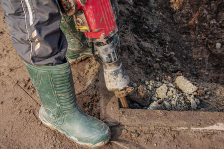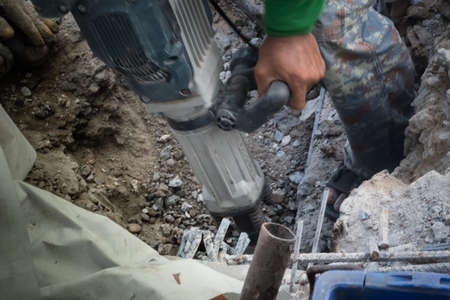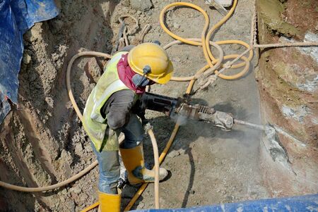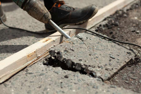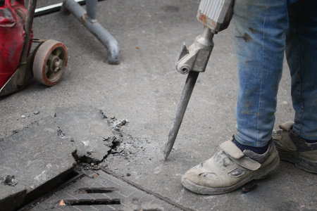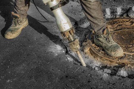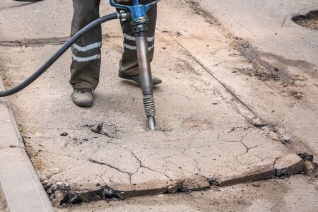Worker digging and drilling concrete surfaces using jackhammer as part of construction road construction