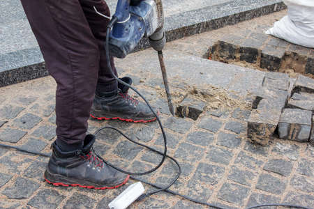A male worker repairs curbs with a jackhammer. The work of the municipal service.