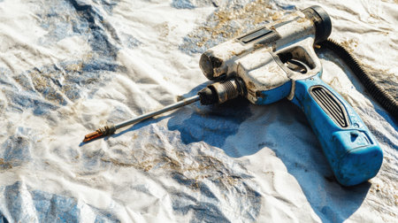 A close-up view of a dirty pneumatic spray gun with a nozzle resting on a textured surface, capturing the essence of industrial craftsmanship and maintenance.