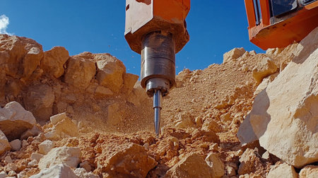 A close-up view of heavy machinery drilling into rocky terrain on a construction site, showcasing dust and debris scattering in the air under a clear blue sky.