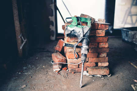 Construction tool, industrial jackhammer with demolition debris and bricks