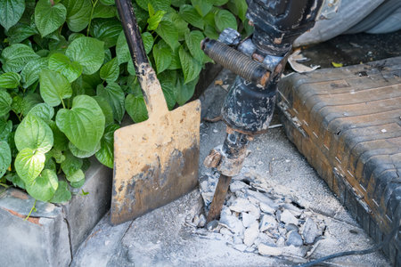 Electric jackhammer and shovel resting beside a broken concrete surface near green plants and construction tools