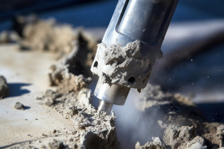 jack hammer used for breaking, chipping, and demolishing concrete close-up of bit with crushed concrete and shadow