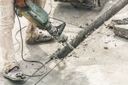 Worker use Electric Concrete Breaker. Worker destroy surface with jackhammer, drilling concrete construction works.