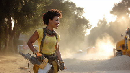 Black Female Construction Worker Smiling with Jackhammer at Dusty Worksite