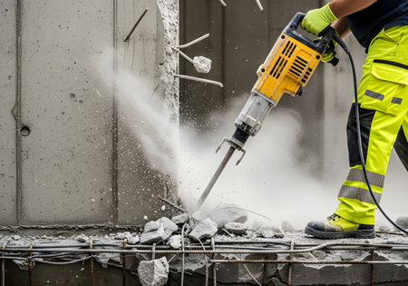 A construction worker efficiently operates a jackhammer, breaking through a concrete wall while dust billows around, highlighting labor and determination in action.