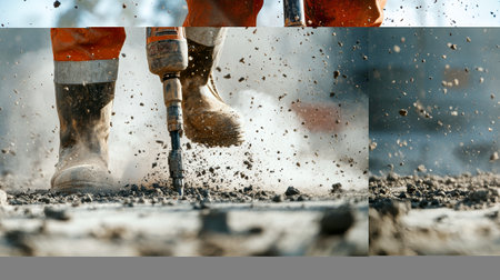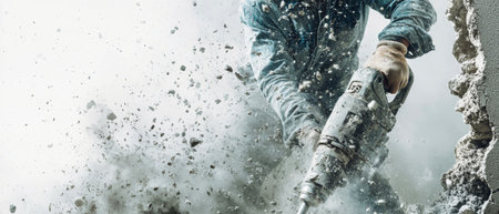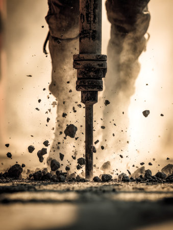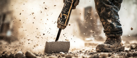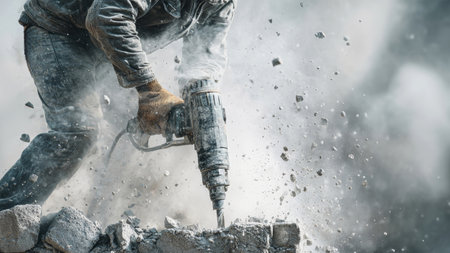 A powerful jackhammer shatters a concrete surface, sending a flurry of fragments and dust flying in dynamic motion, capturing the intensity of construction work.