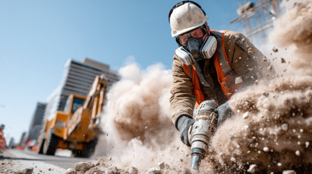 A construction worker operates a jackhammer, skillfully breaking concrete while dust and debris swirl around in a busy urban environment.
