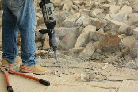 Industrial construction work demolishing a concrete wall with jackhammer. Details of construction