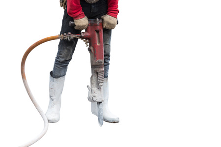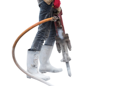Construction worker removes excess concrete with drilling machine in construction site. Isolated on white background.