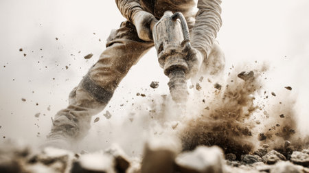 A man is using a jackhammer to break up a rock. The scene is intense and dangerous, as the man is in close proximity to the flying debris. Concept of power and strength