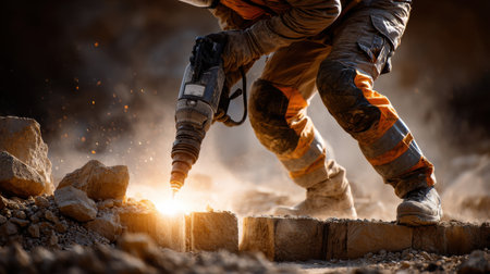 A man is using a jackhammer to break up rocks. The scene is gritty and dirty, with the man's orange pants and boots standing out against the brown background. Concept of hard work and determination