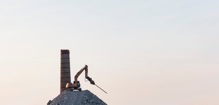 Excavator using hydraulic hammer for breaking concrete at a construction site