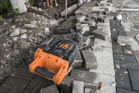 Electric Concrete Breaker laying on a road of cobblestone during sidewalk construction works.