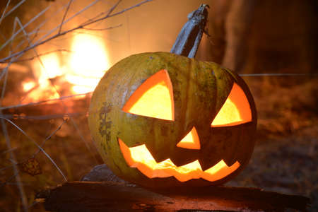 Scary Halloween lantern, made of pumpkin at the dark forest. Spooky Halloween outdoor backdrop.