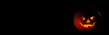 A glowing carved pumpkin head creating a spooky Halloween background in the dark.