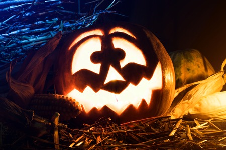 Halloween pumpkin with scary face. Jack-o-lantern in the dark. Celebration autumn holiday