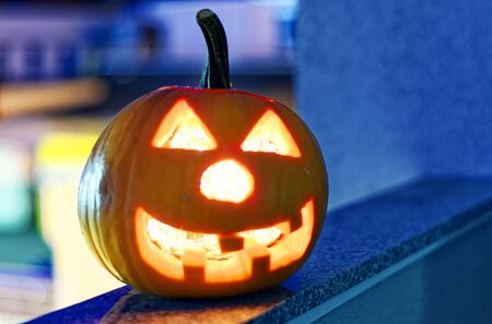 Photo for the holiday Halloween. Evil pumpkin lamp background. All Saints Eve