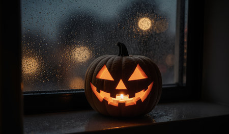 A carved pumpkin lantern emits a warm glow in the dark, rainy evening. Outside, drops race down the windowpane, creating a cozy and spooky atmosphere perfect for Halloween.