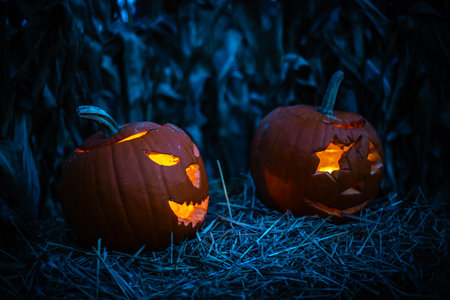 Halloween. Carved Halloween pumpkins glowing with candlelight inside at night, spooky and festive atmosphere with dark background.