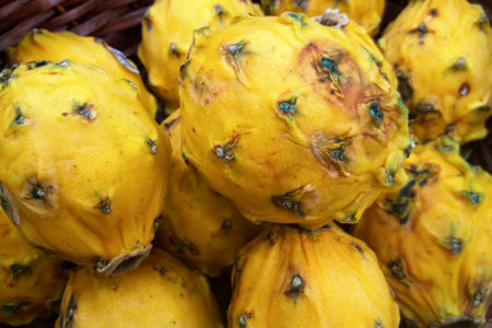 Close-up on a stack of yellow dragon fruits inside a basket on a market stall.