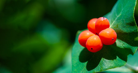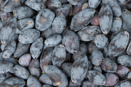 A group of fresh wild honeysuckle dark blue berries is in summer