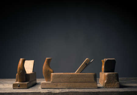 Old jointers on a wooden workbench background. Woodwork. Carpentry.