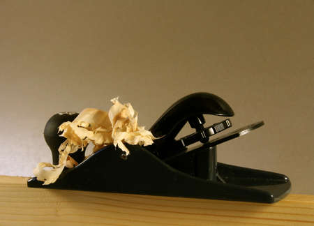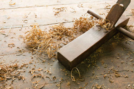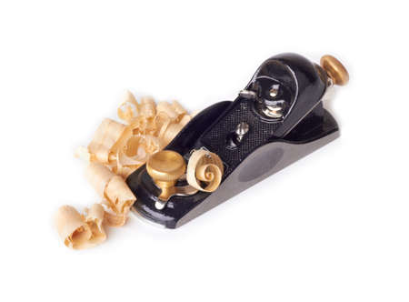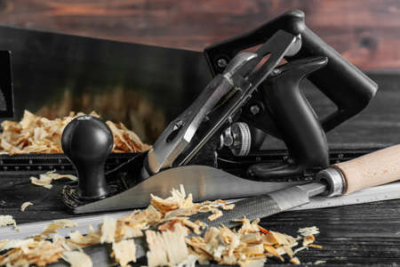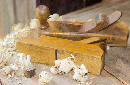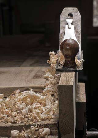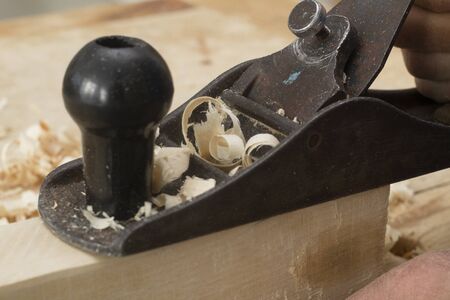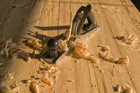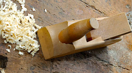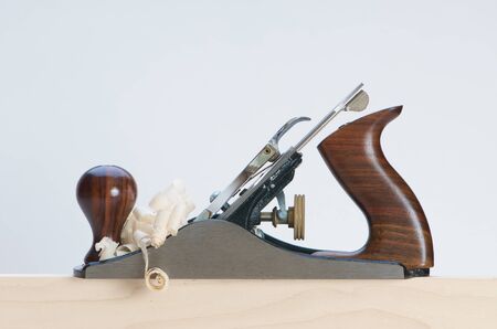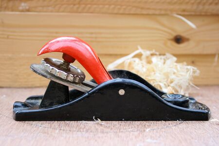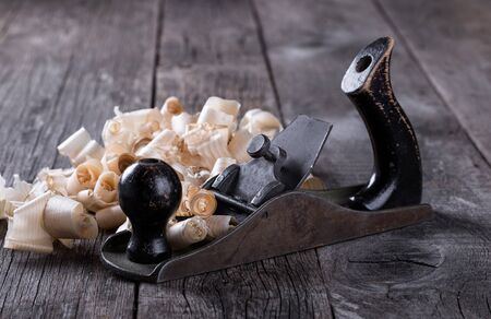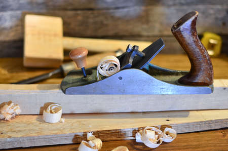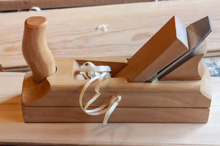 Metal planer with wood shavings. Carpenter cabinet maker hand tools on the workbench.
