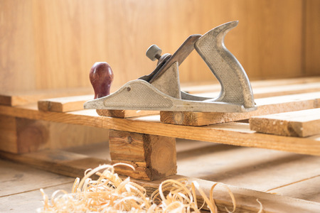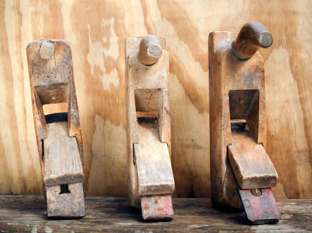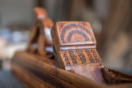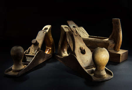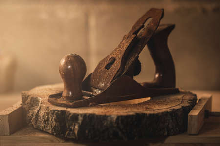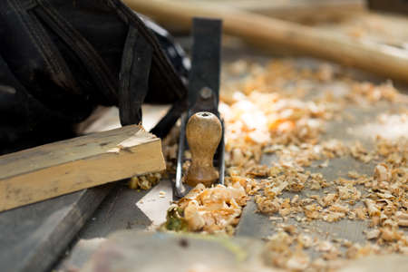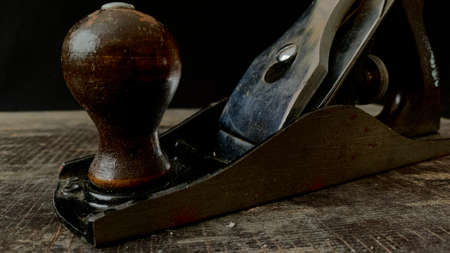 Carpenter's wood plane and other woodworking tools close up with foreground focus