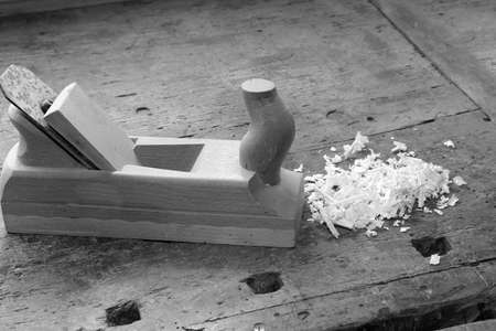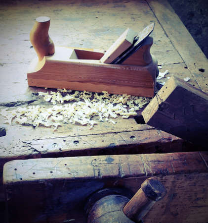Planer with sawdust on the woodworking craft Workbench with vintage effect