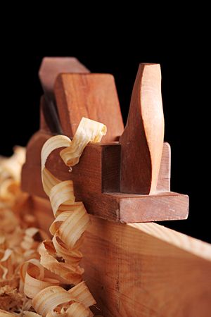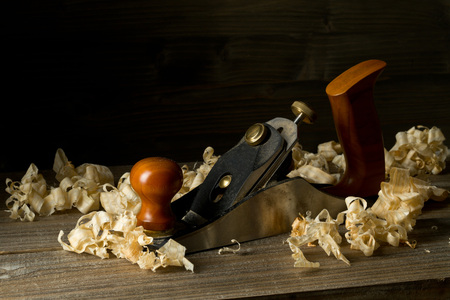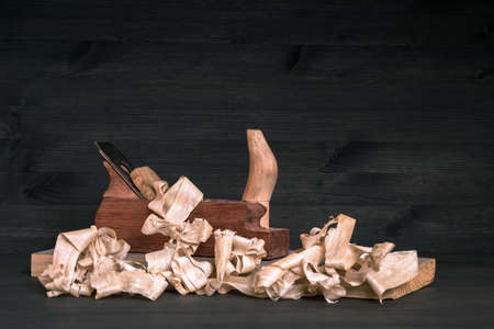 Classic red oak wood plane in a pile of fine wood shavings on a dark wooden background.