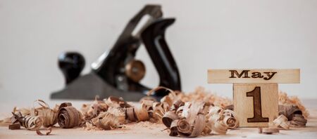 Old wooden jointer and shaving on wooden table. Selective focus.