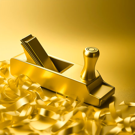 Classic metal hand planer smoothing wooden plank in workshop sunlight with detailed wood shavings and polished handles visible.