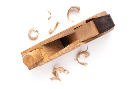 Carpentry tool wooden plane on a white background. Craftsman. Carpenter profession. Wood processing. Working tool of the plane. Background image. Place for your text. Handmade.